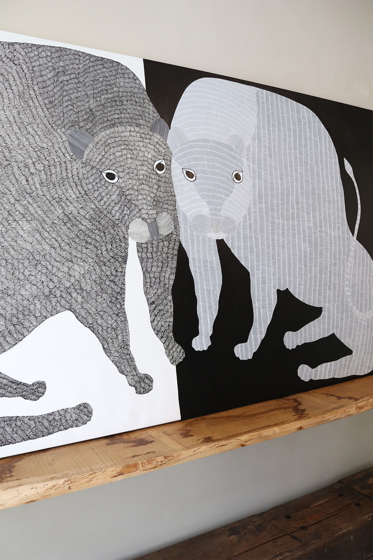 Gareeba Singh Tekam’s practice is pushing the visual boundaries of Gond art with his signature lions but still using original Gond art motifs. He has created a series of paintings that play with the idea of duality - light and dark, white and black, and the sun and moon. Gond or Pardhan painting is a popular indigenous art tradition from Madhya Pradesh dating at least 1500 years. The art relies on dots and dashes for its motifs. It depicts nature and myth, often with bright colours.