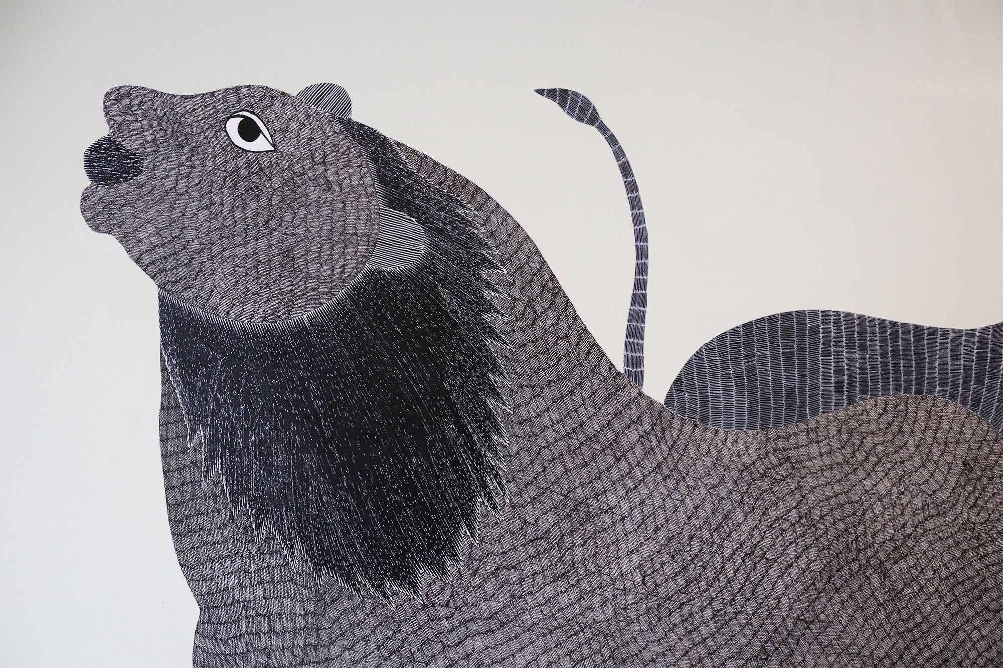 Gareeba Singh Tekam’s practice is pushing the visual boundaries of Gond art with his signature lions but still using original Gond art motifs. He has created a series of paintings that play with the idea of duality - light and dark, white and black, and the sun and moon. Gond or Pardhan painting is a popular indigenous art tradition from Madhya Pradesh dating at least 1500 years. The art relies on dots and dashes for its motifs. It depicts nature and myth, often with bright colours.