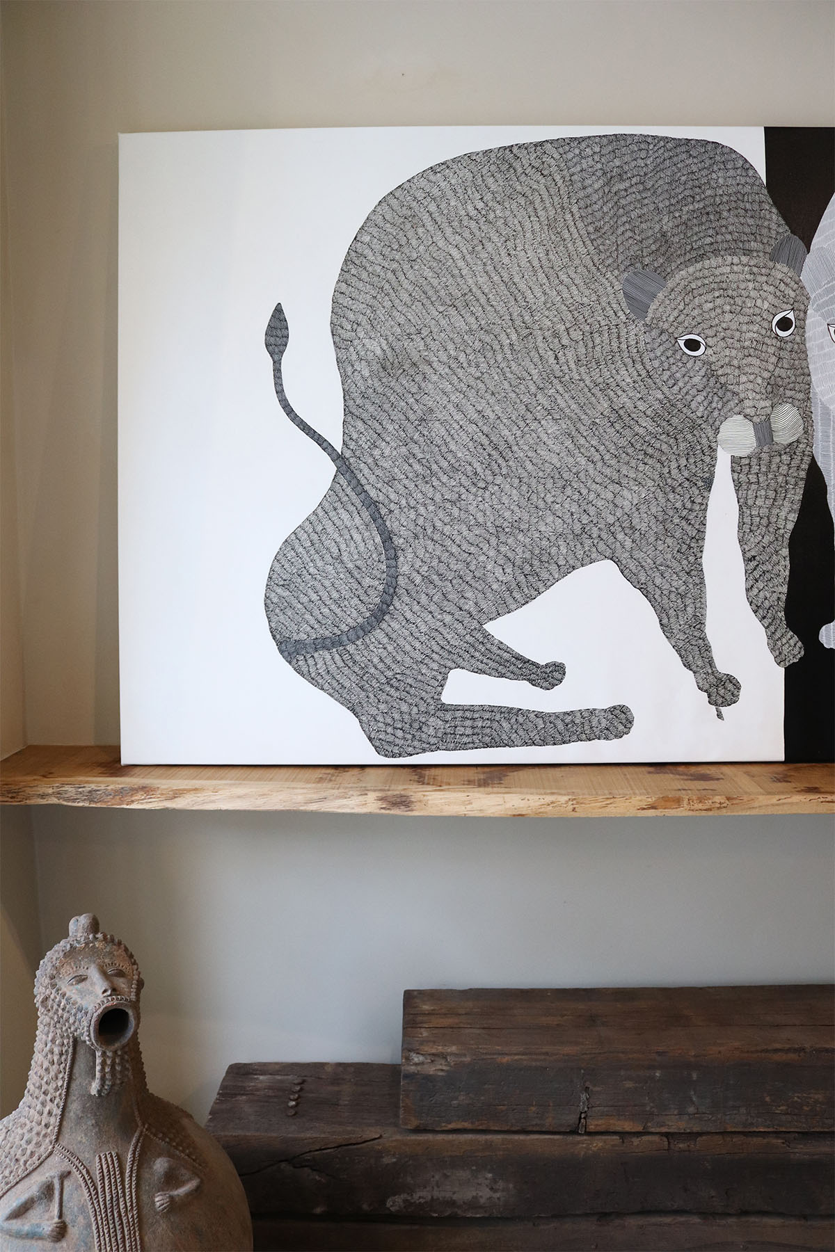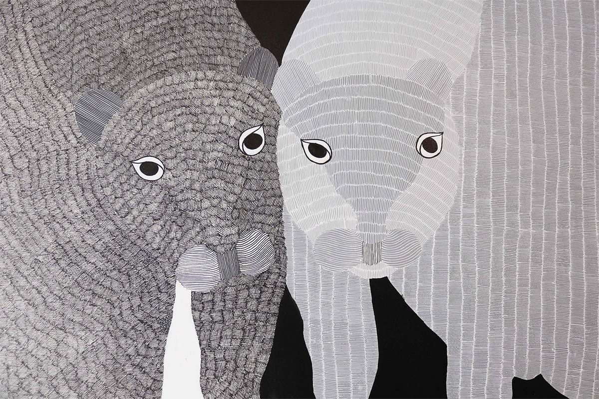 Gareeba Singh Tekam’s practice is pushing the visual boundaries of Gond art with his signature lions but still using original Gond art motifs. He has created a series of paintings that play with the idea of duality - light and dark, white and black, and the sun and moon. Gond or Pardhan painting is a popular indigenous art tradition from Madhya Pradesh dating at least 1500 years. The art relies on dots and dashes for its motifs. It depicts nature and myth, often with bright colours.