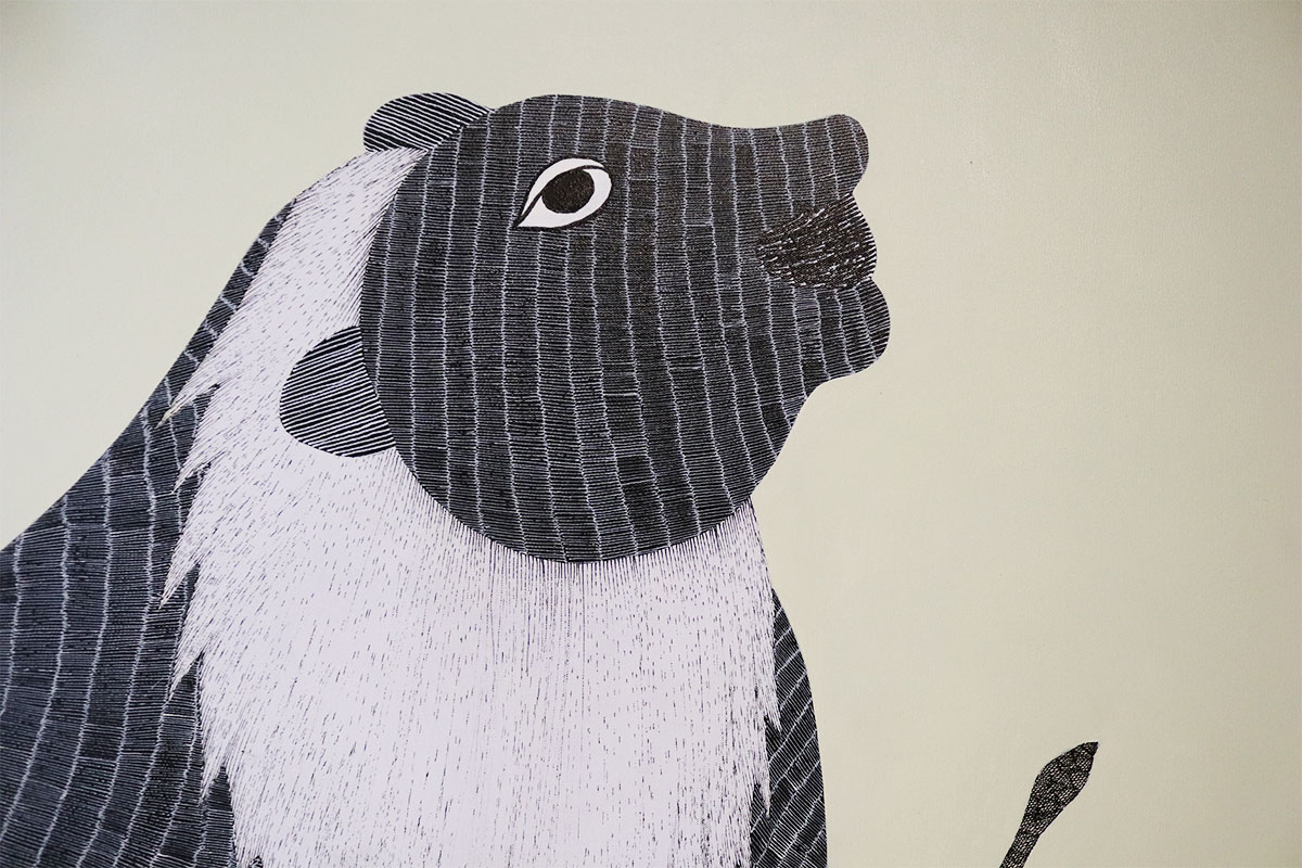 Gareeba Singh Tekam’s practice is pushing the visual boundaries of Gond art with his signature lions but still using original Gond art motifs. He has created a series of paintings that play with the idea of duality - light and dark, white and black, and the sun and moon. Gond or Pardhan painting is a popular indigenous art tradition from Madhya Pradesh dating at least 1500 years. The art relies on dots and dashes for its motifs. It depicts nature and myth, often with bright colours.