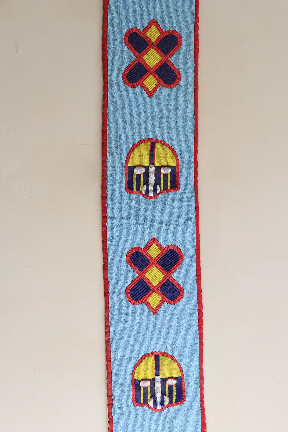 Meticulously hand-beaded and crafted, these sashes are inspired by those historically worn by Ifa priestesses to symbolize their spiritual status during public ceremonies. Today, these sashes are still handmade in Nigeria by the Yoruba people. Beads and cowrie shells, historically symbols of wealth and status, continue to be integral to their design. Common motifs include Yoruba faces with vertical cheek scarification, as well as various animals and geometric patterns.