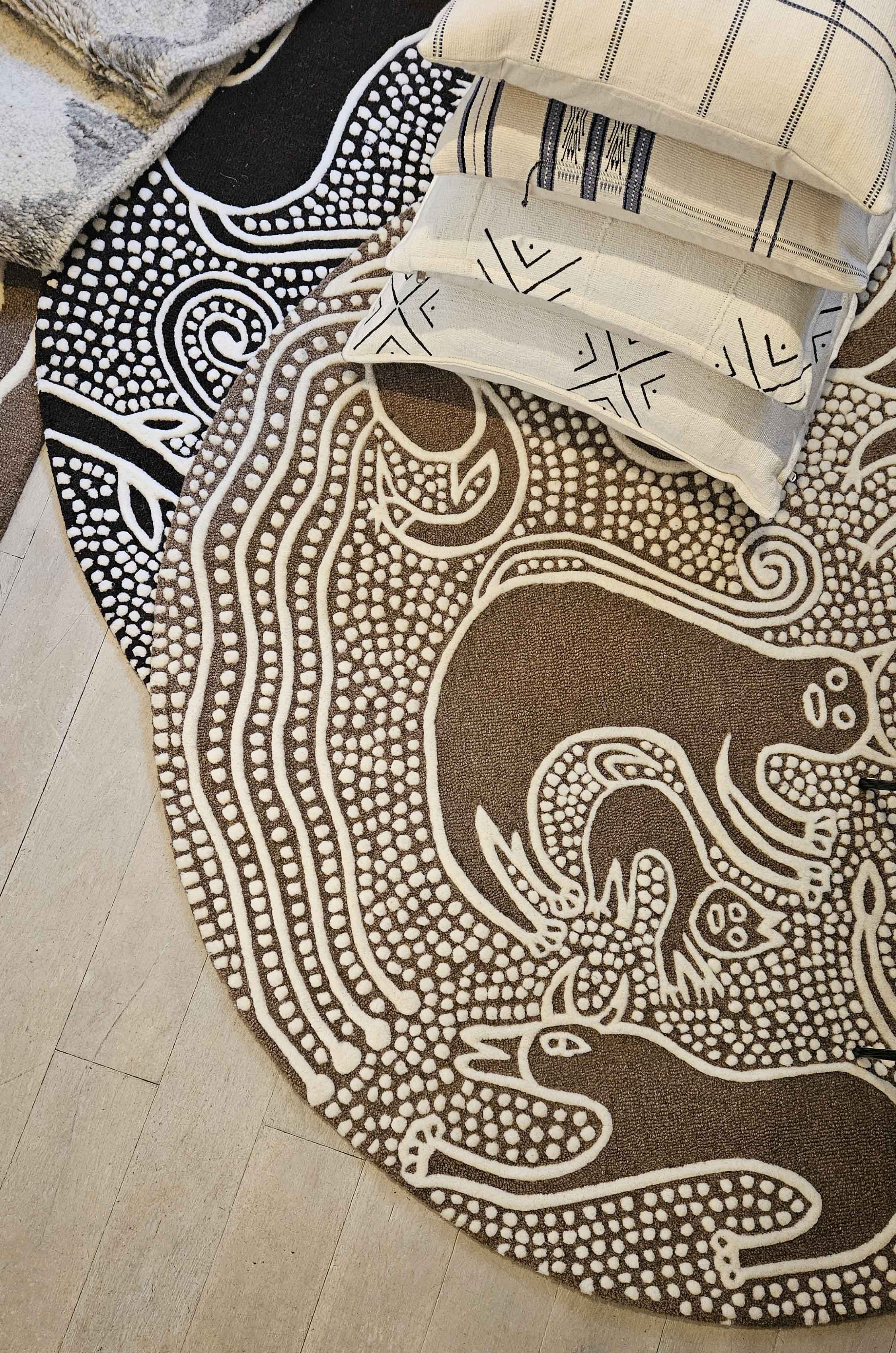Her artwork done through a residency at KAASH (EVOKE London's sister gallery in Bangalore, India) is applied to create head-turning hand-tufted rugs.