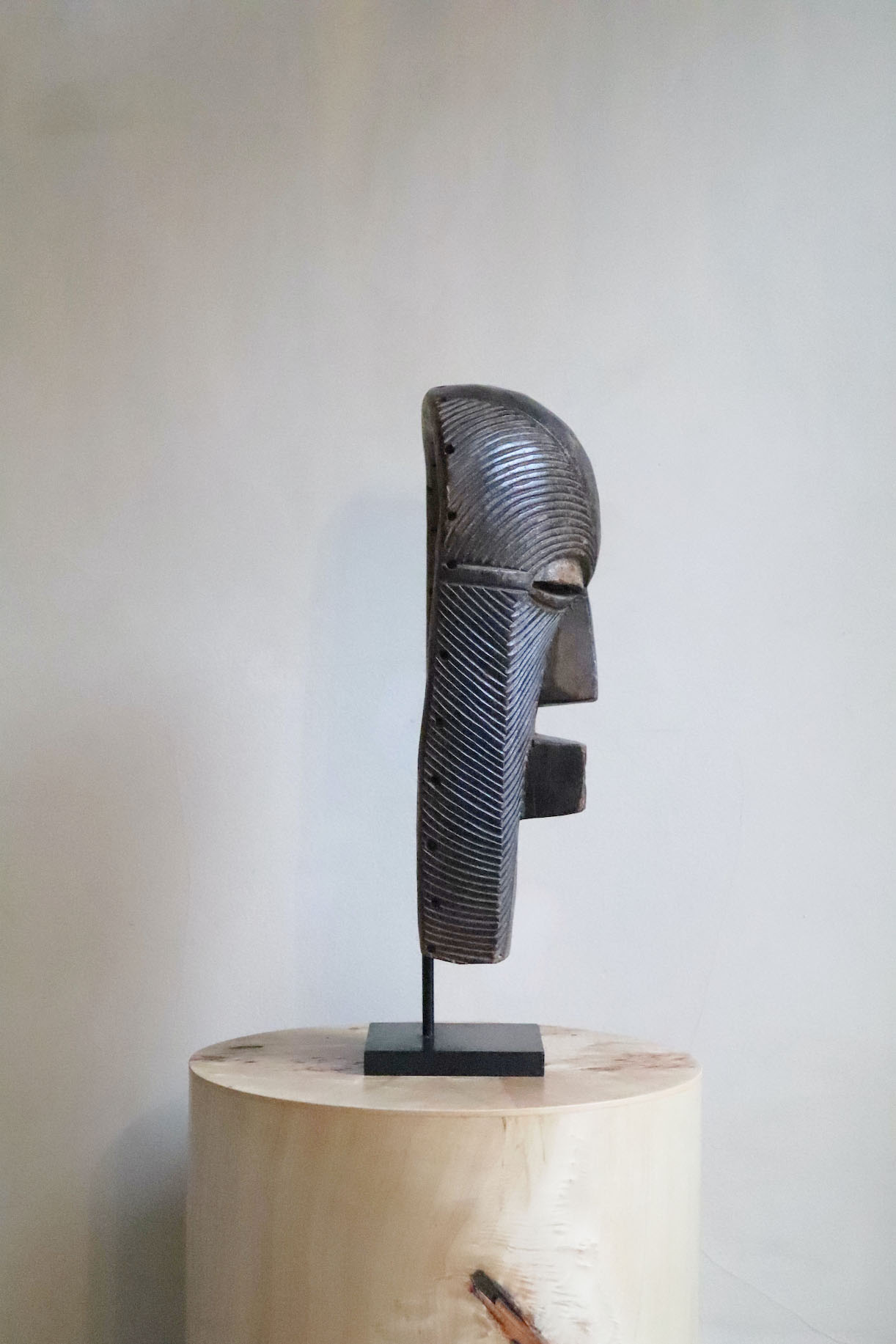 The face of a typical Songye Kifwebe mask is covered with linear incisions, a square protruding mouth and a linear nose set between globular pierced eyes. They are used by the Bwadi Bwa Kifwebe secret society to maintain social order, connect with spirits, and for ceremonies.