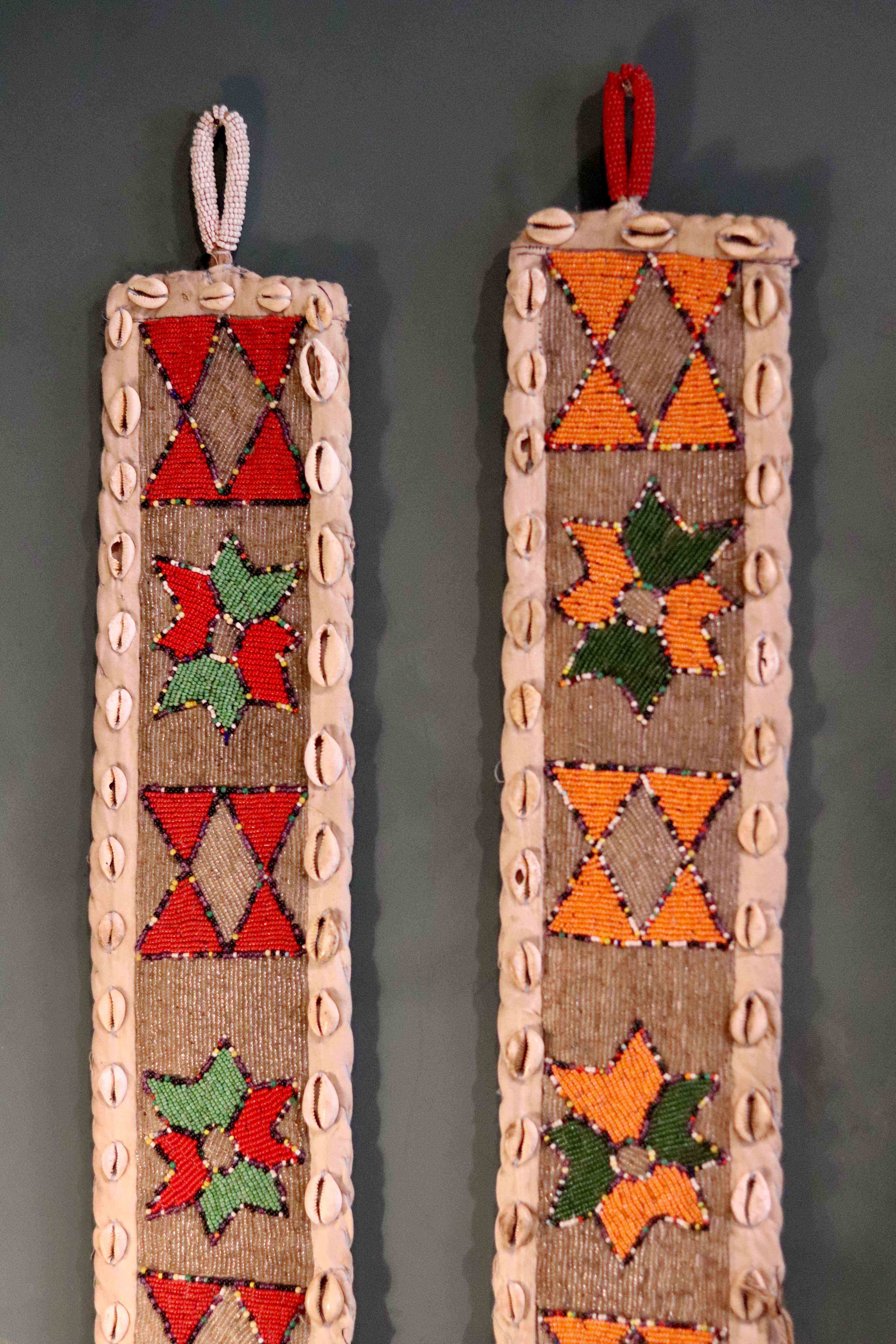 Meticulously hand-beaded and crafted, these sashes are inspired by those historically worn by Ifa priestesses to symbolize their spiritual status during public ceremonies. Today, these sashes are still handmade in Nigeria by the Yoruba people. Beads and cowrie shells, historically symbols of wealth and status, continue to be integral to their design. Common motifs include Yoruba faces with vertical cheek scarification, as well as various animals and geometric patterns.