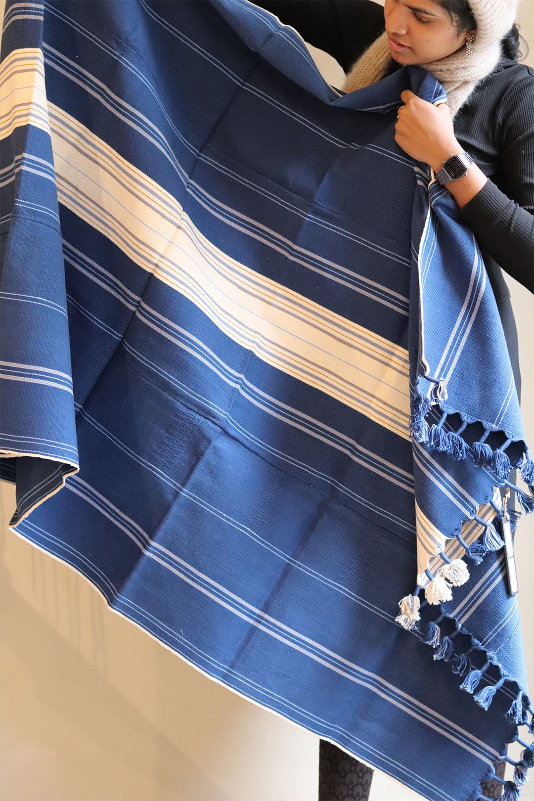 This beautifully textural throw has been handwoven by women artisans in the North Eastern state of Nagaland, home to several indigenous tribal groups with rich craft traditions. Traditional textiles in Nagaland are typically woven on a short-width, back-strap loom also known as a loin loom. Weaving is a part of everyday life for many Naga women, organically included in the schedule of the day. Weaving has also become a source of livelihood for the women, with a growing interest in the textural, short-width Naga weaves which translate beautifully to textiles for the home.