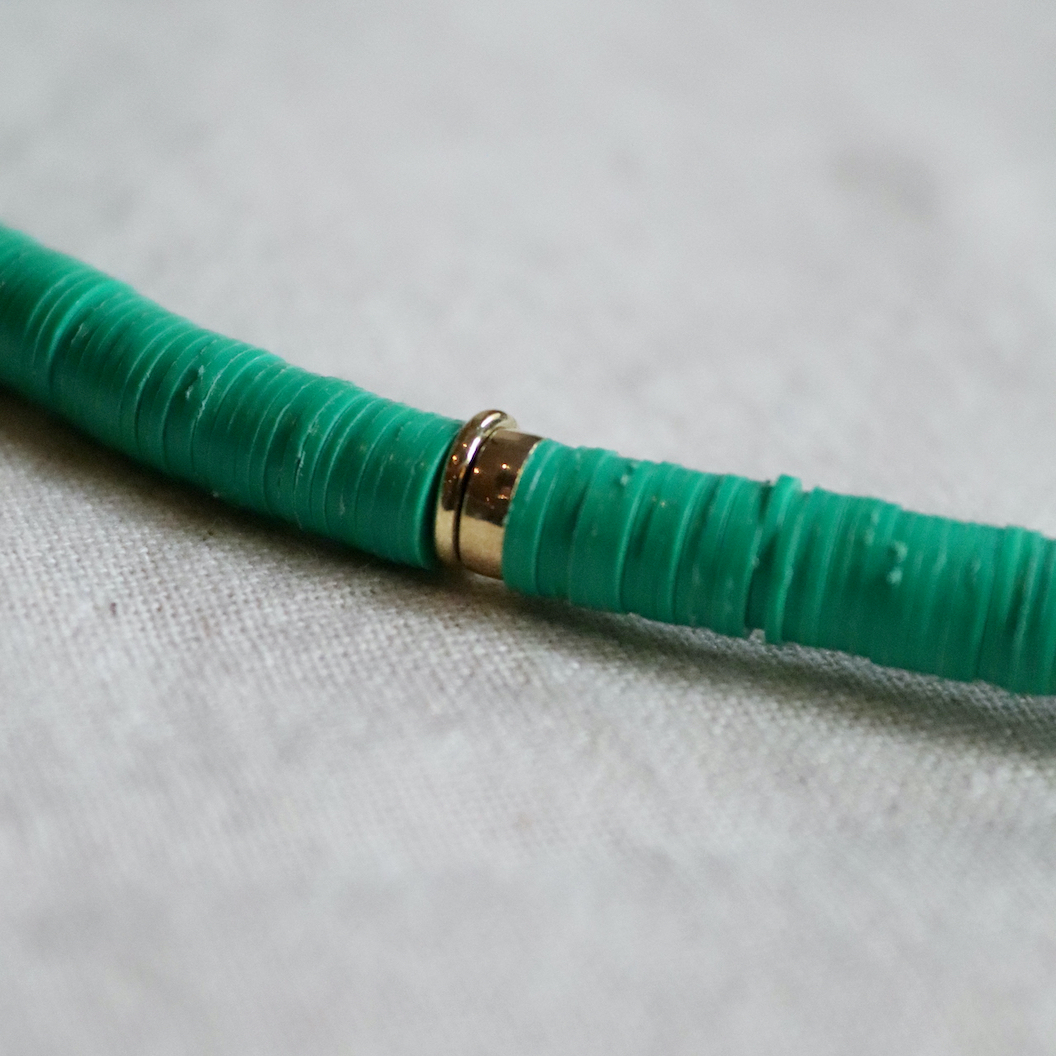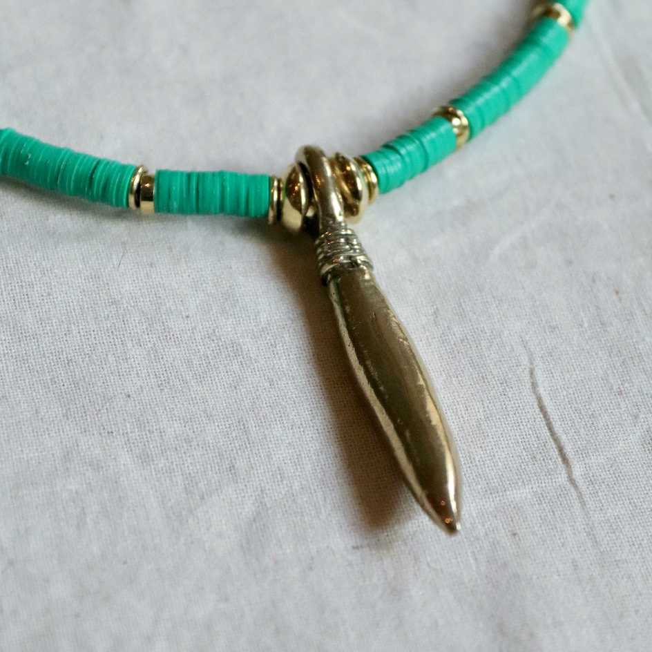 Bronze "female cache sexe" pendant from Cameroon on green disc cord and bronze West African beads.