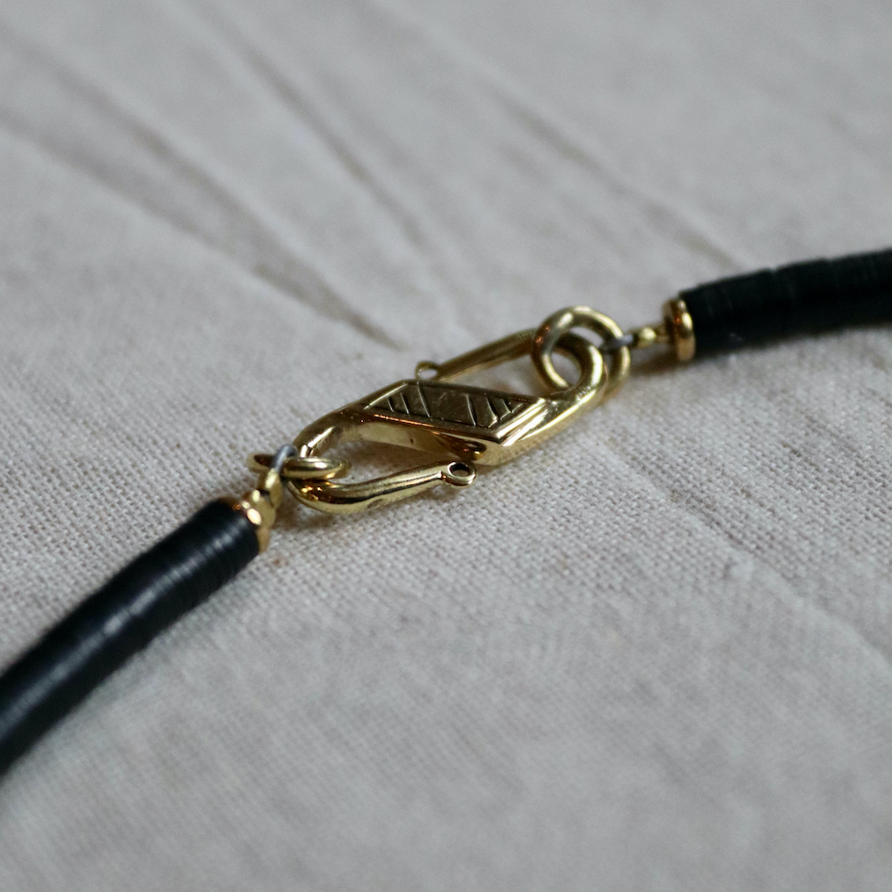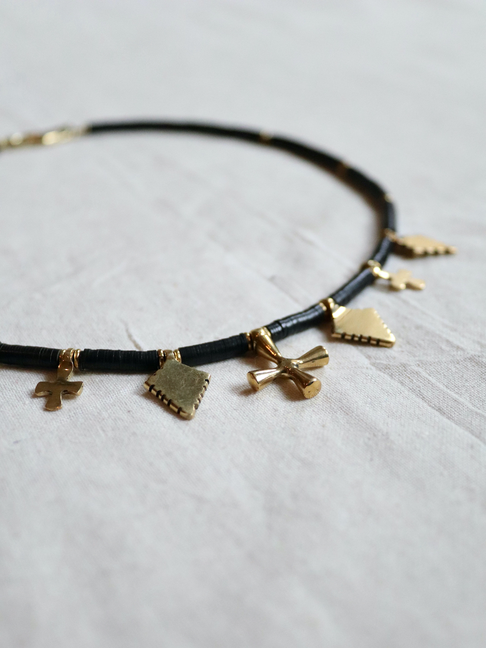 ETHIOPIAN BRONZE CROSSES, BLACK DISC CORD NECKLACE