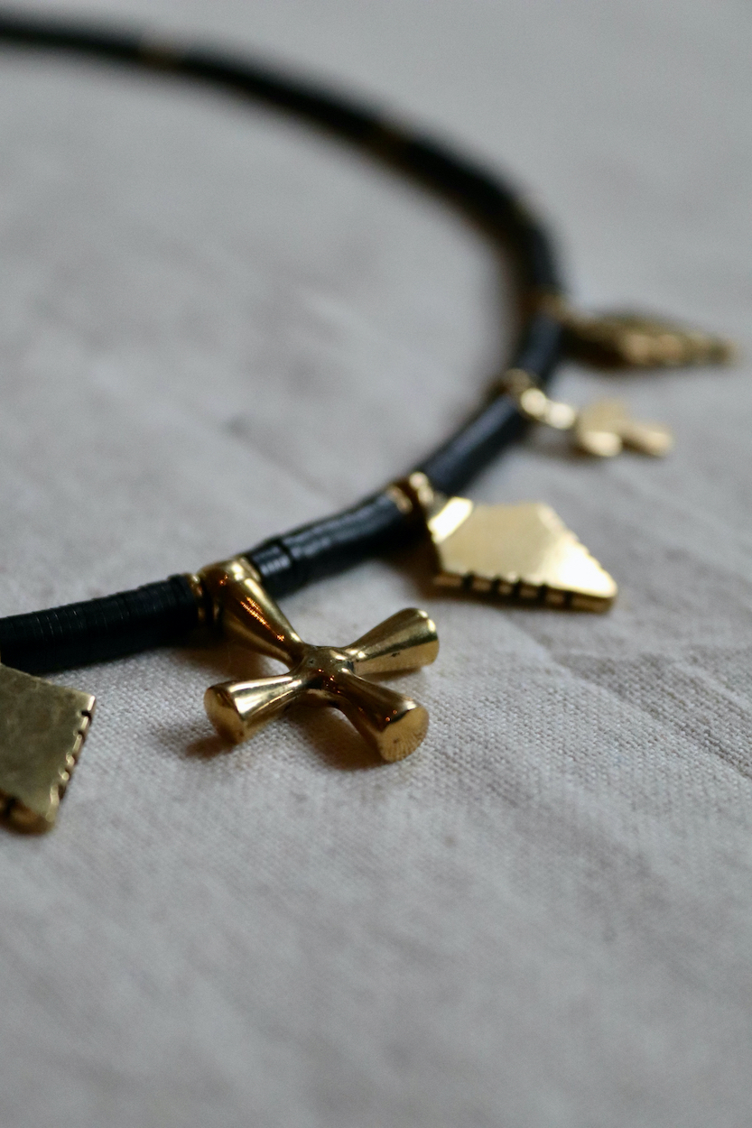 Necklace of a collection of bronze Ethiopian neck crosses on black disc cord from west Africa