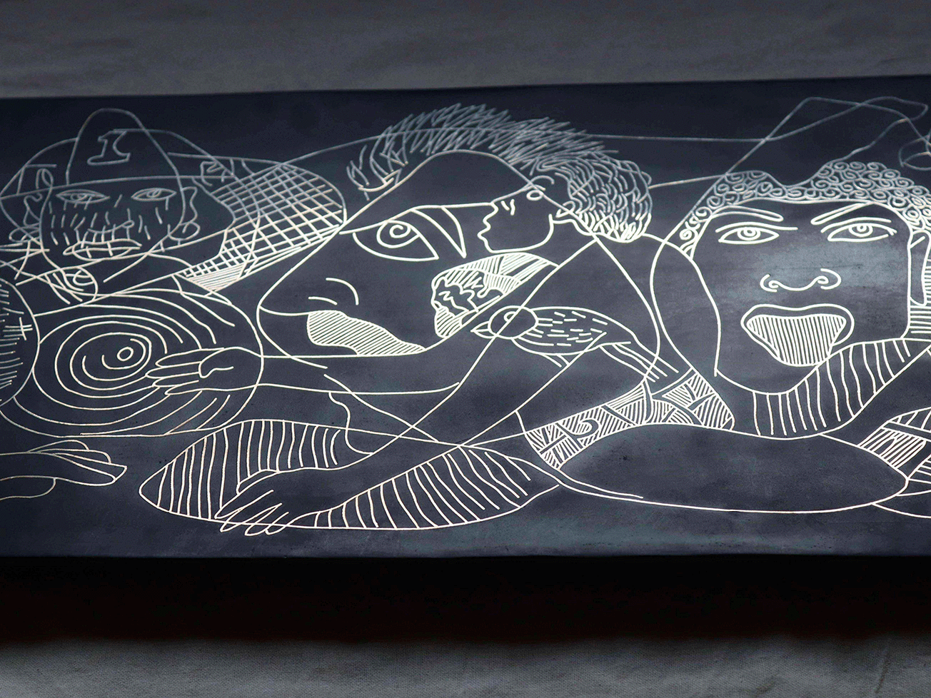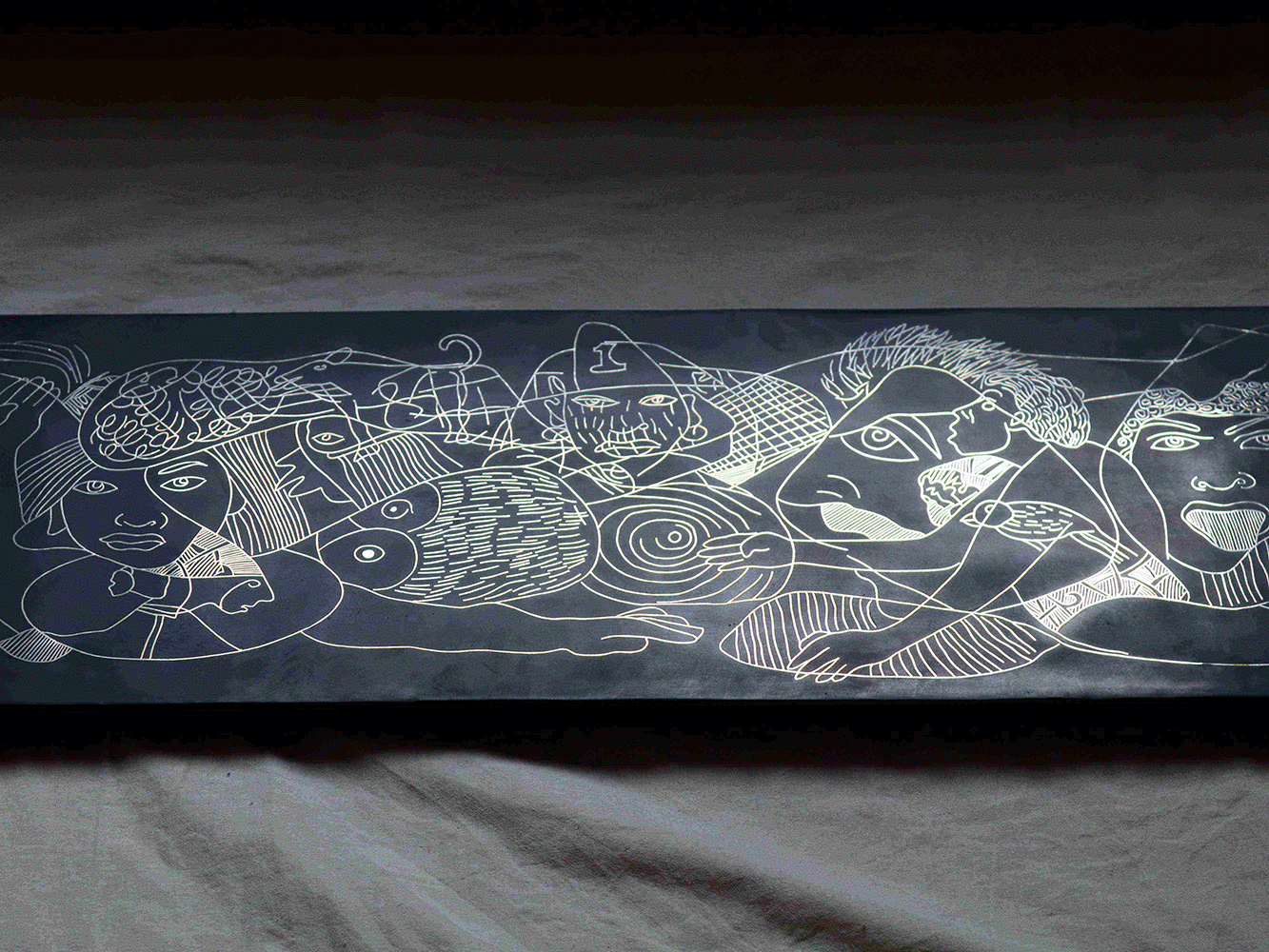 Pradeep Kumar D M is a multidisciplinary artist whose practice merges Lambani folk traditions with contemporary art. Trained in fine arts, his work draws from his nomadic heritage, blending tribal embroidery, drawing, and found materials like terracotta tiles and gourds. Through this, he creates layered narratives that explore ecology, labor, and cultural identity.
