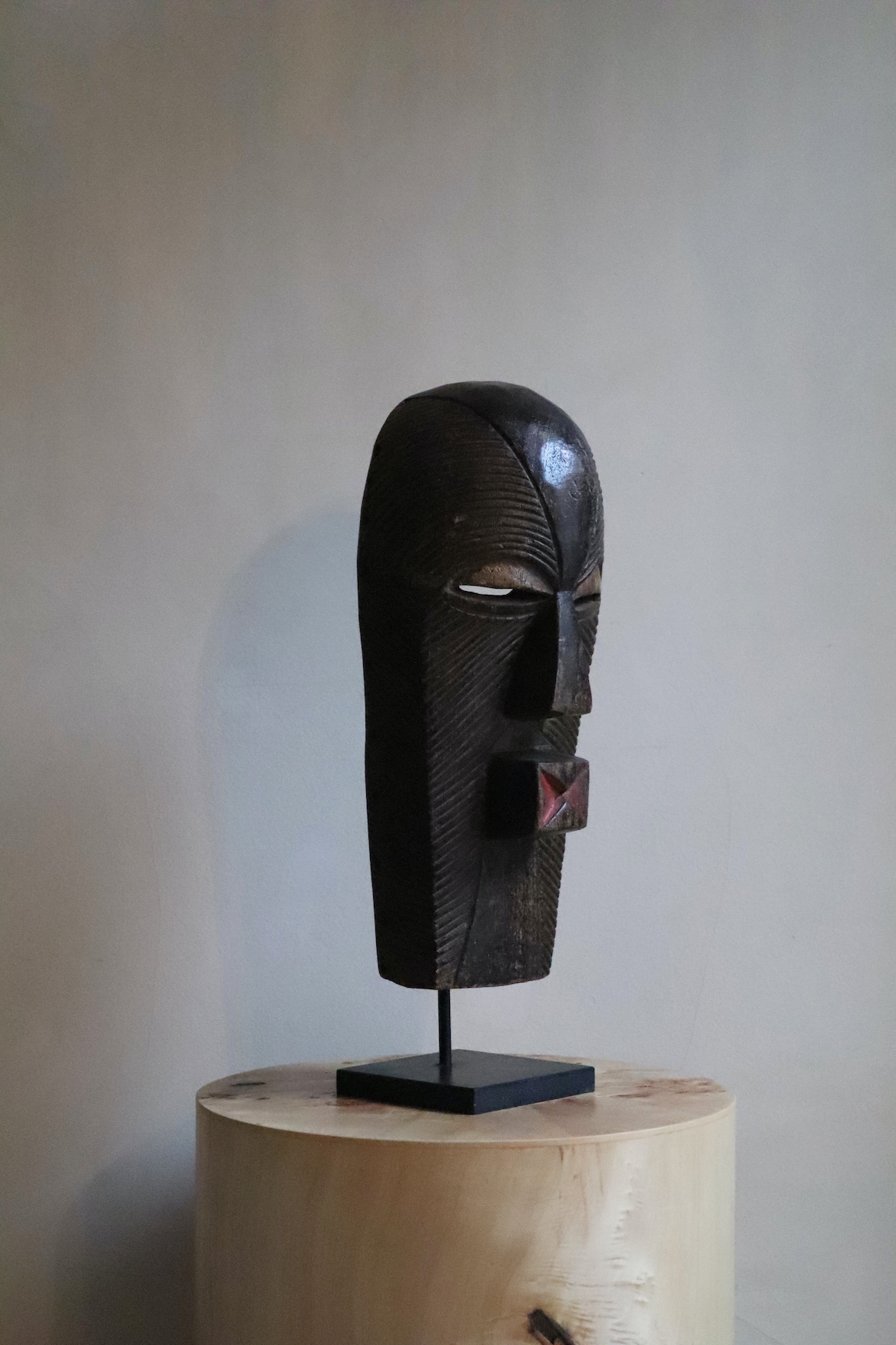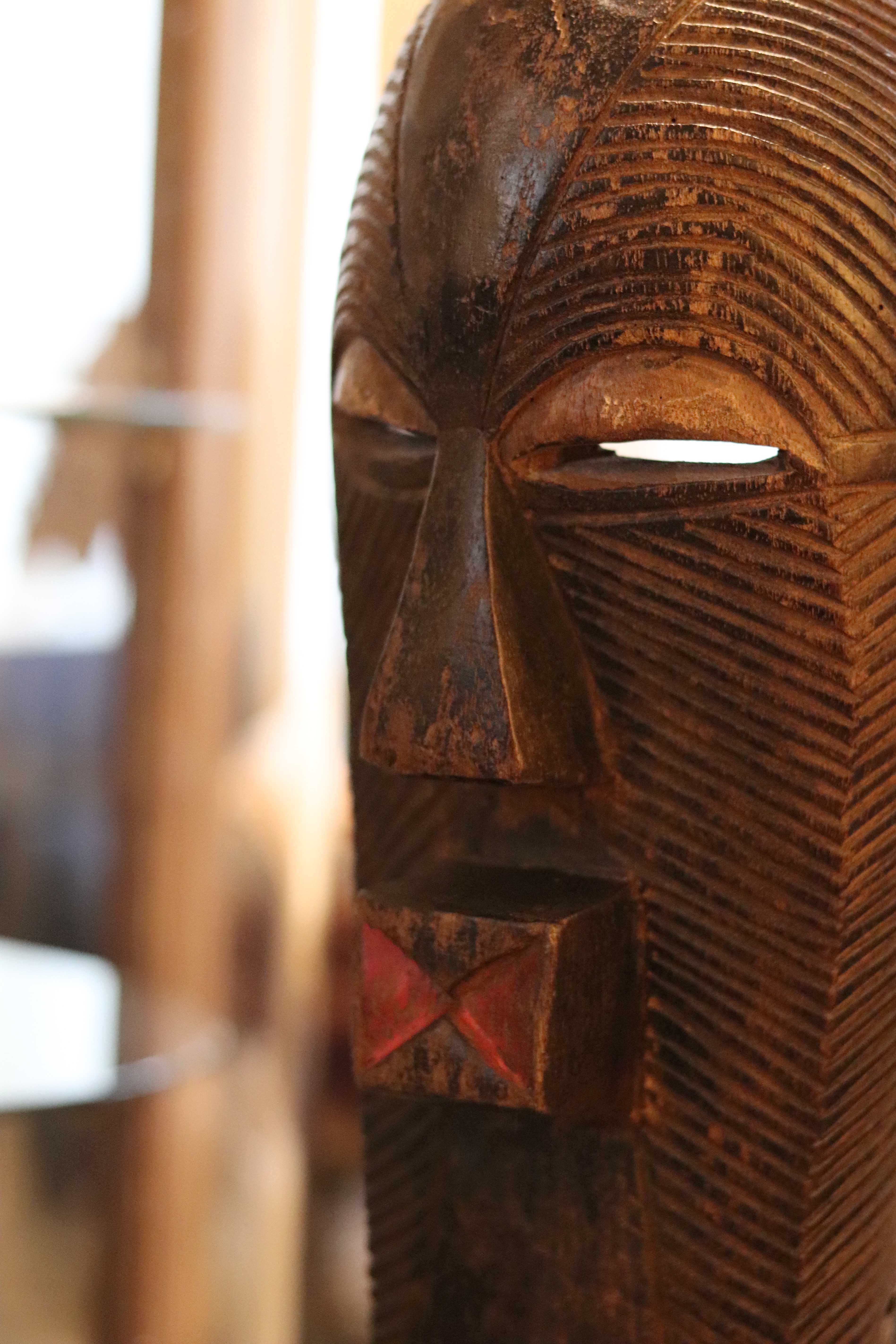 The face of a typical Songye Kifwebe mask is covered with linear incisions, a square protruding mouth and a linear nose set between globular pierced eyes. They are used by the Bwadi Bwa Kifwebe secret society to maintain social order, connect with spirits, and for ceremonies.