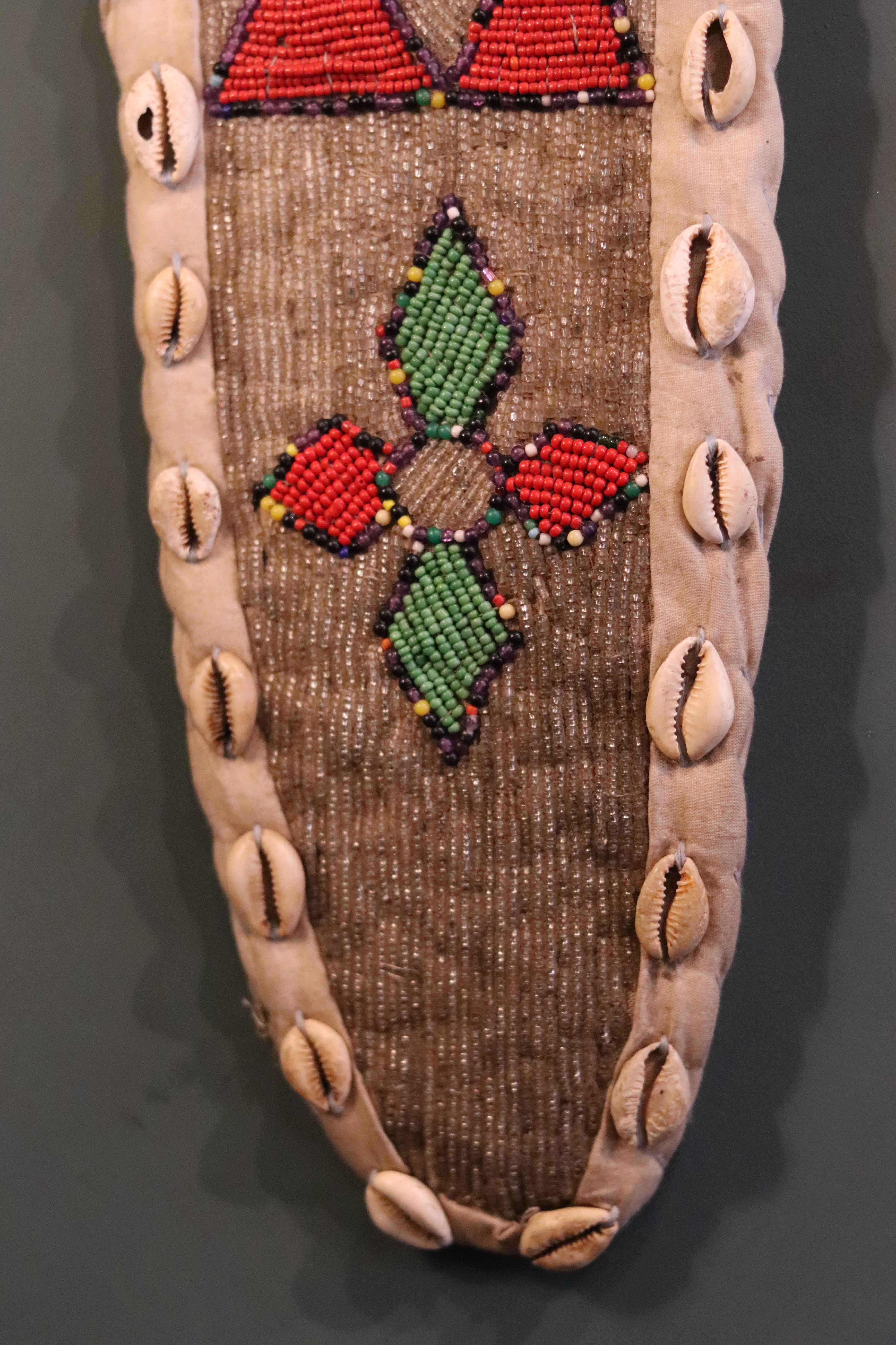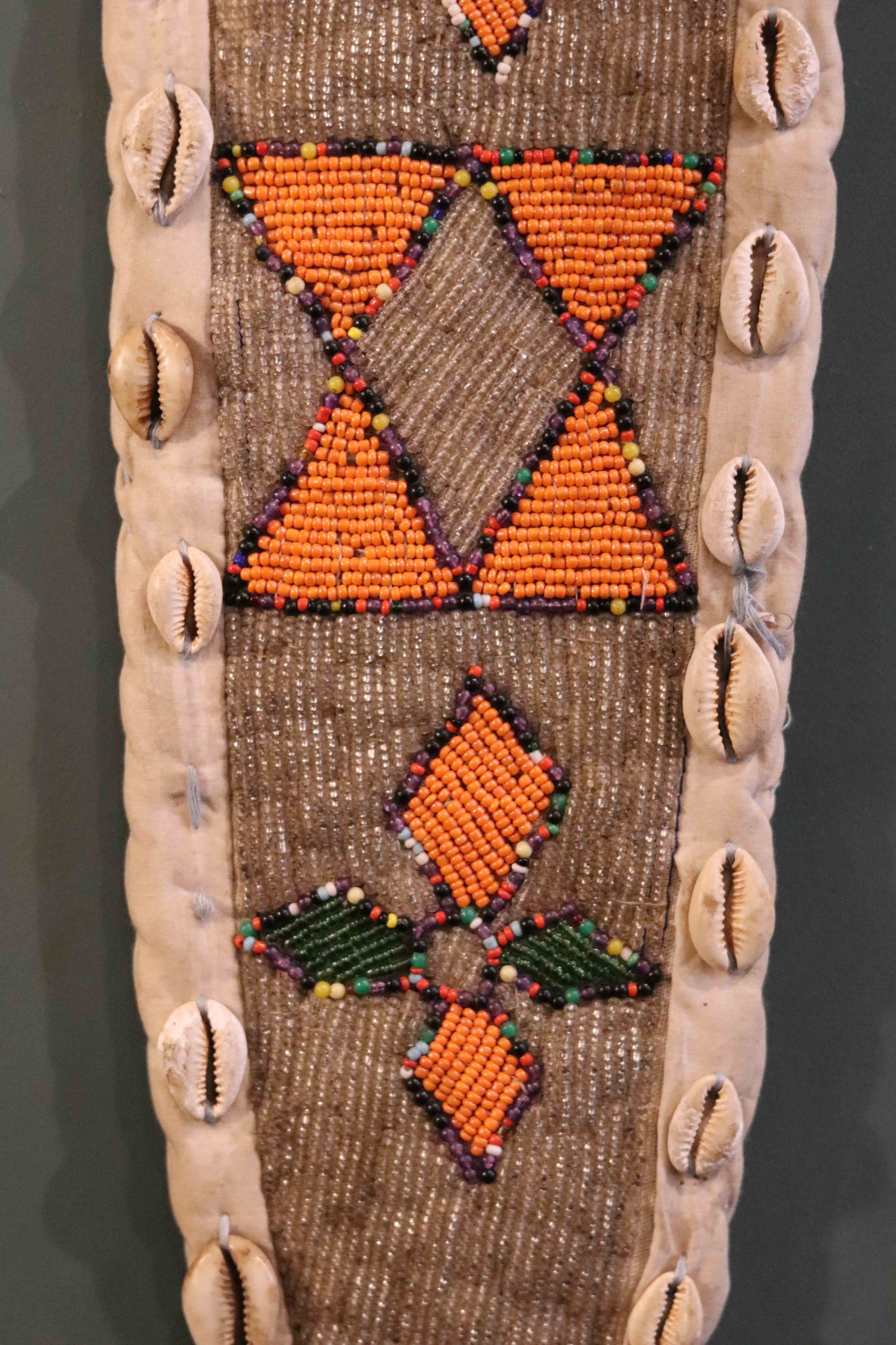 Glass beads, cotton backing material, cowrie shells.
