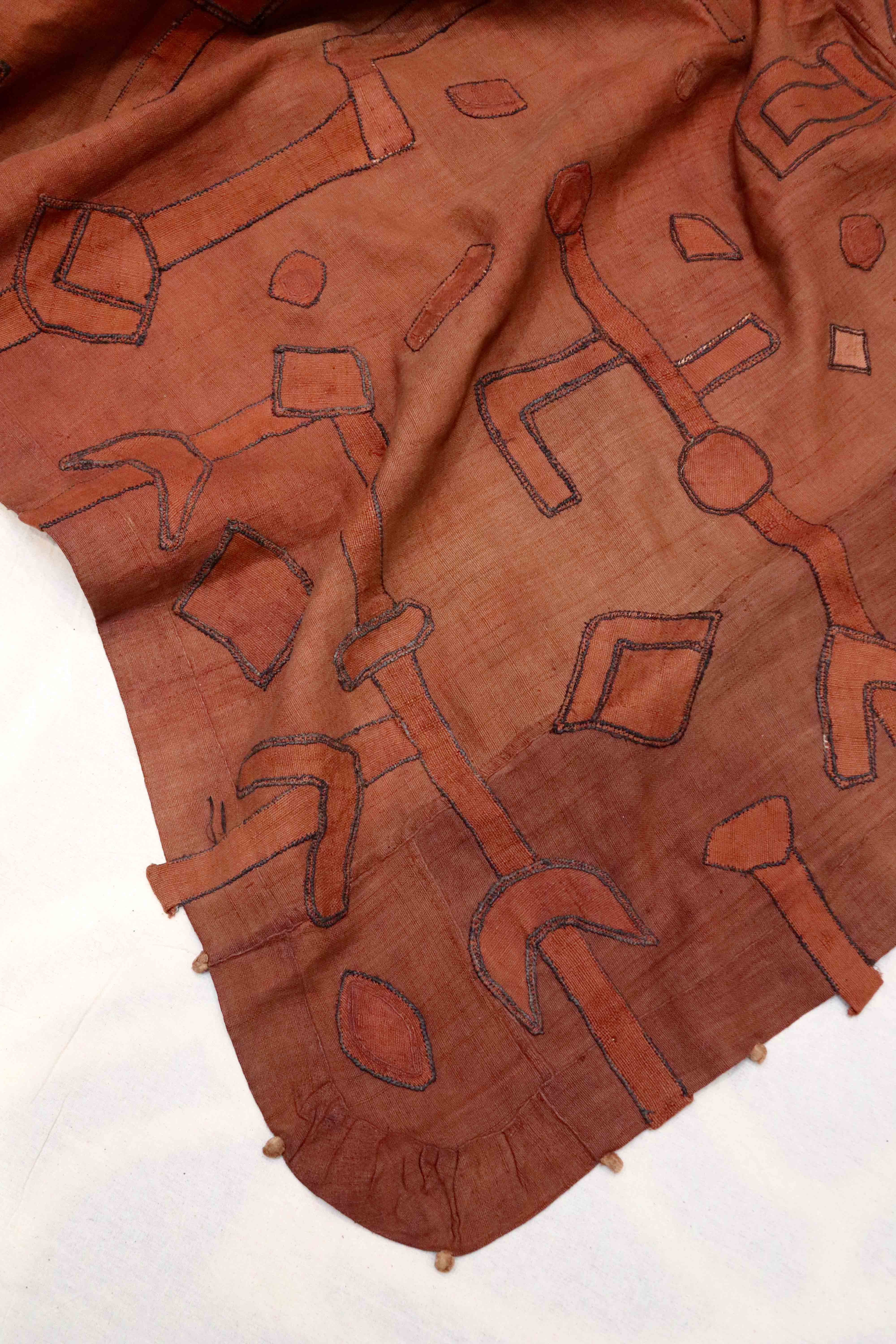 The finished cloths are worn as overskirts, called ntshack when worn by women and mapel when worn by men. These garments are draped around the waist over a longer underskirt and secured with a belt. They are typically worn during important ceremonies and dances. At funerals, raffia cloths carry a profound significance as they symbolize security and continuity, connecting the living with each other and with the deceased. Chiefs may also commission these cloths for specific ceremonial purposes, and the most skilled weavers may be employed for up to a year to produce these elaborate textiles.