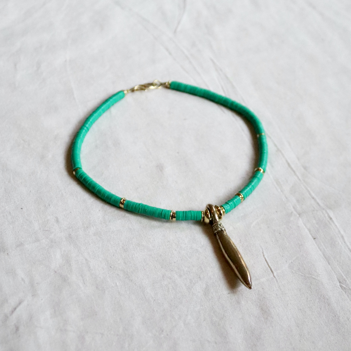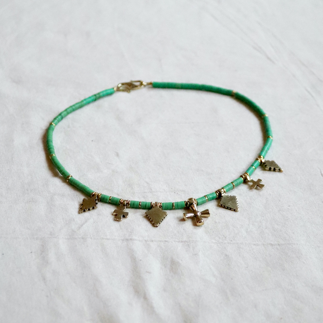 GREEN DISC CORD, BRONZE CAMEROON CHARM NECKLACE