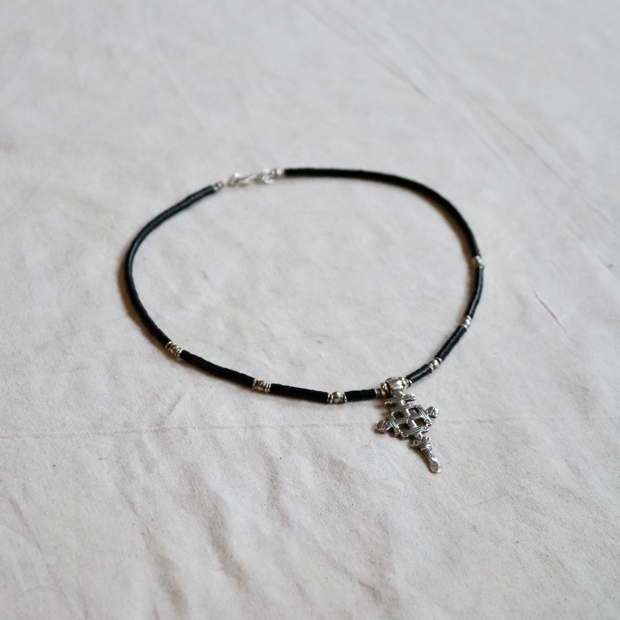 ETHIOPIAN SILVER COPTIC CROSS, BLACK DISC CORD NECKLACE