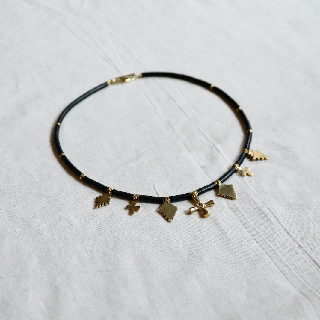 ETHIOPIAN BRONZE CROSSES, BLACK DISC CORD NECKLACE