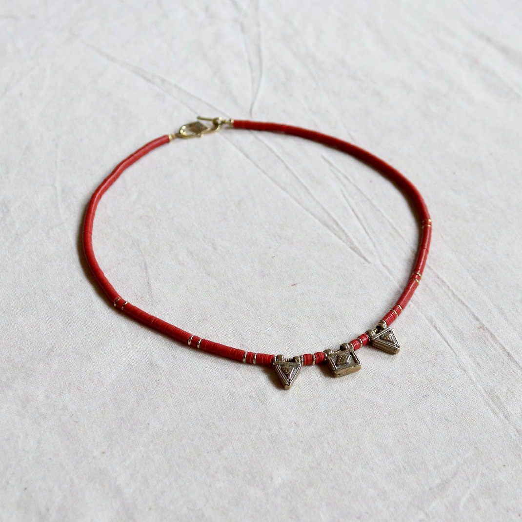 ETHIOPIAN BRONZE BOXES AND BEADS, RED DISC CORD NECKLACE